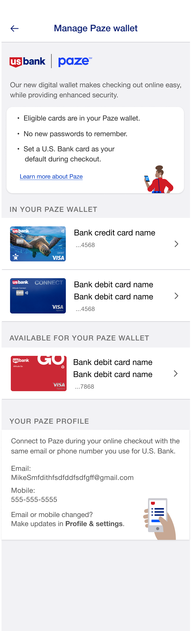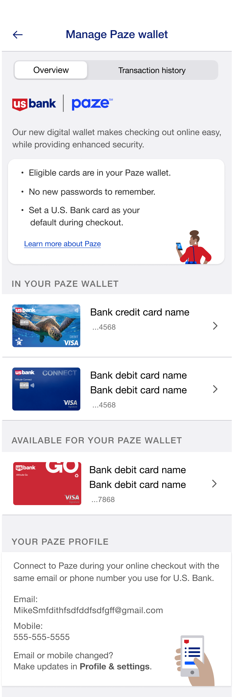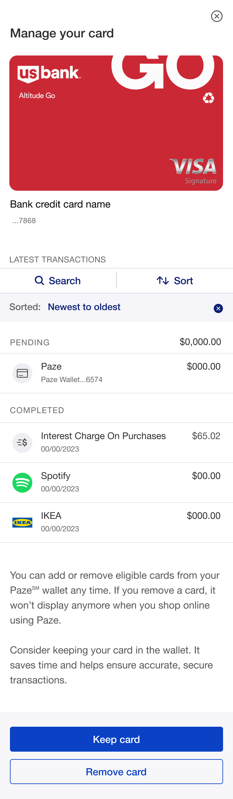 US Bank needed to design an intuitive transaction history interface for the Paze digital wallet, allowing users to easily view and manage transactions across multiple credit cards. The challenge was to create a seamless experience that provided clear visibility into Paze transactions while offering flexible filtering and navigation options for users.