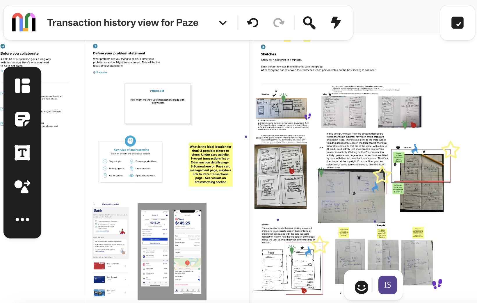 My team employed a design thinking approach to develop the Paze Transaction History interface. We began with brainstorming sessions using Mural to generate ideas, framed the problem with a "How Might We" statement ("How might we show users transactions made with Paze wallet?"), and conducted a "Crazy 4s" sketching exercise (4 sketches in 4 minutes). After voting on the best concepts, we designed a solution in Figma featuring a dashboard with Paze-enrolled card indicators, a wallet view with links to transaction activity, and a detailed transaction page with filtering options by card, date, merchant, and amount, alongside visual elements like graphs and incentive bars.